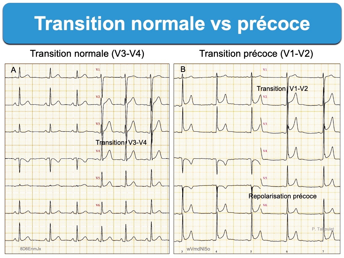 - Le binôme de dérivations où R > S devient R < S s’appelle la zone de transition. La zone de transition typique est V3-V4, mais il faut l’interpréter en fonction du tracé global.