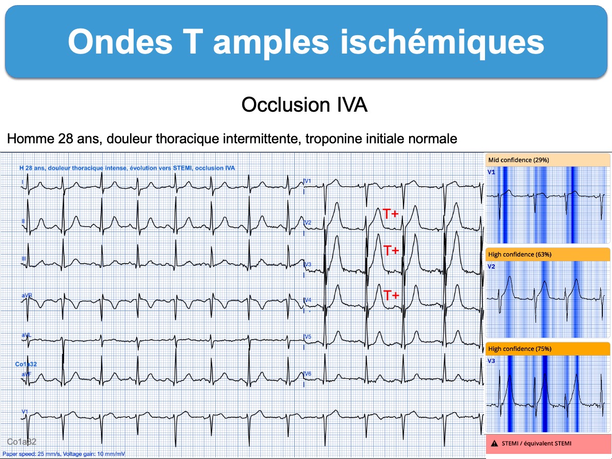 L’intelligence artificielle reconnait bien les ondes T ischémiques aiguës, aspect équivalent d’un ST+. Pour cela, assurez-vous qu’elles persistent ou s’aggravent (et ne soient pas une forme de régression d’un sus-décalage de ST).
