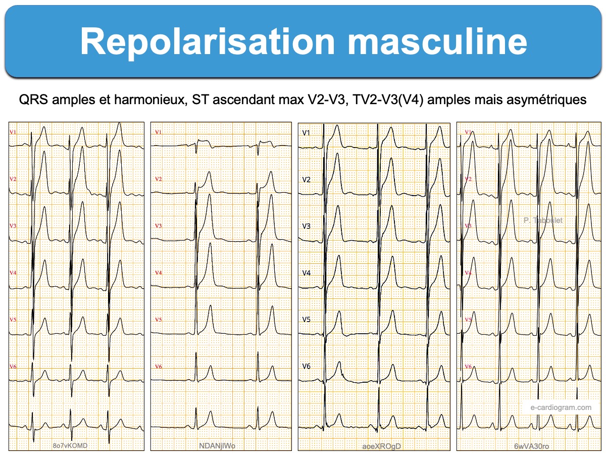 Dans la repolarisation masculine, les QRS sont normaux ou hyperamples (hypervoltés), le sus-décalage de ST prédomine dans les dérivations précordiales droites V2(V3). Il peut atteindre 4 mm avec un angle marqué (> 20°) entre le segment ST et le départ d’une onde T ample, parfois géante > 15 mm (cf. Repolarisation masculine).