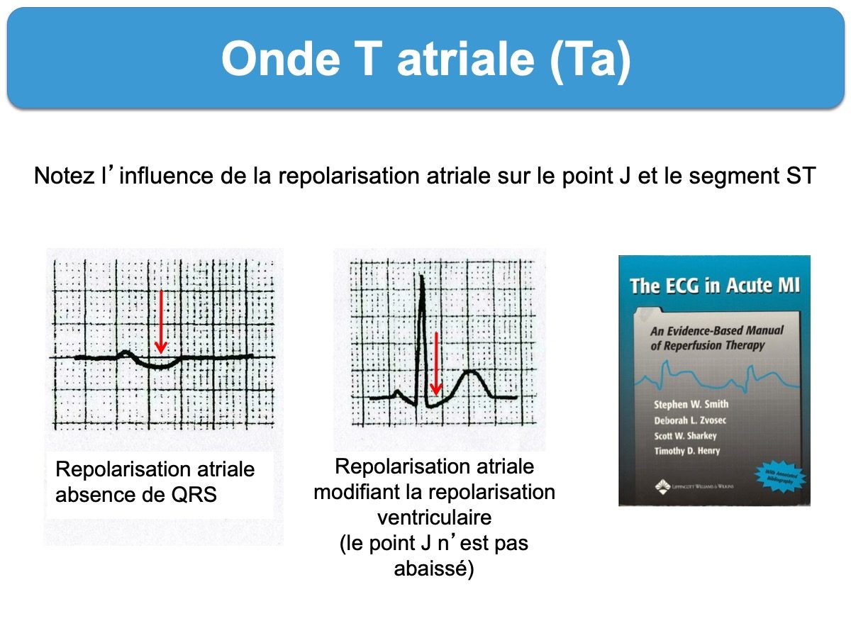L’onde T atriale (Ta) est parfois visible sur un ECG chez un sujet normal, dans le cas d’une tachycardie sinusale (stress), d’une épreuve d’effort ou d’une dyspnée. Dans ce cas, elle débute avec la fin de l’onde P, se poursuit dans le segment PR et se termine habituellement après le QRS dans le segment ST. Sa forme est concave et sa polarité inversée par rapport à l’axe de P.