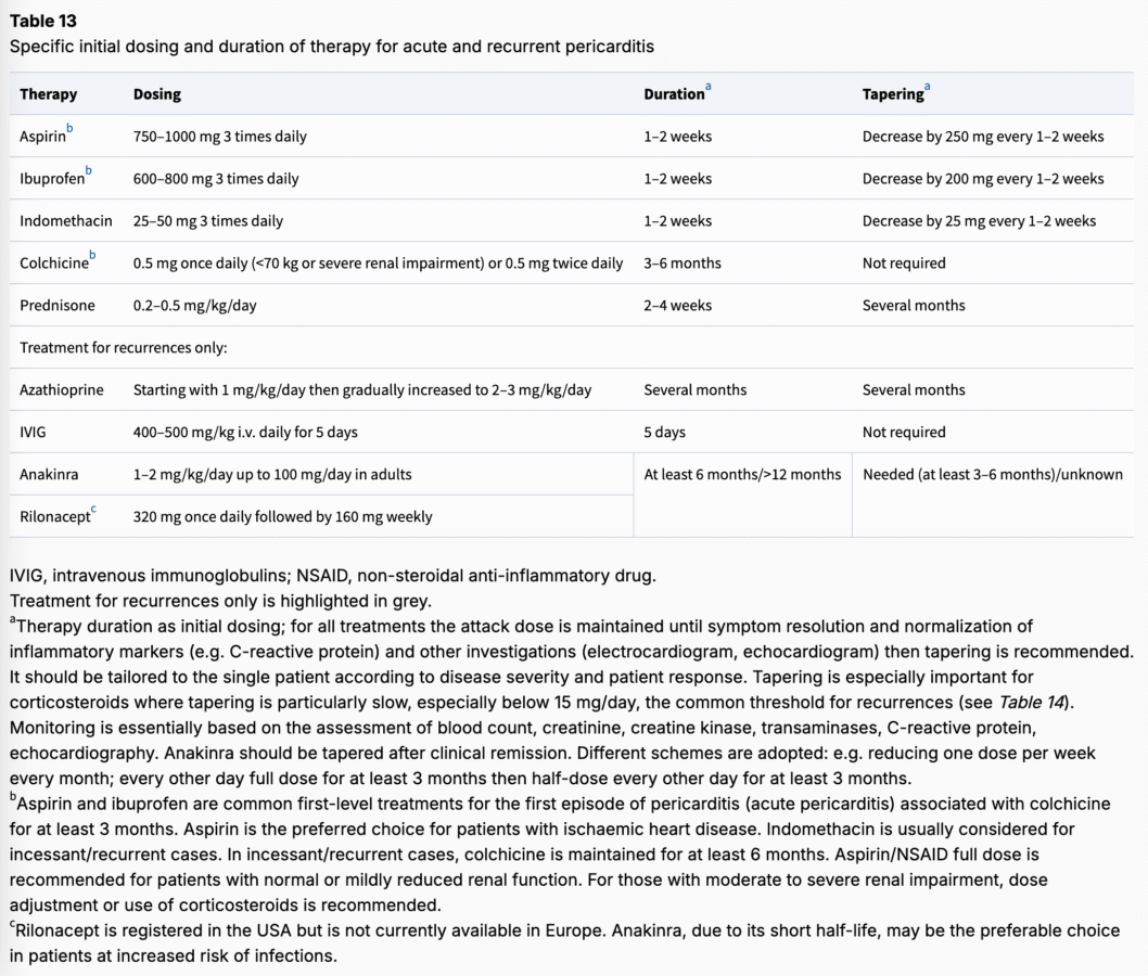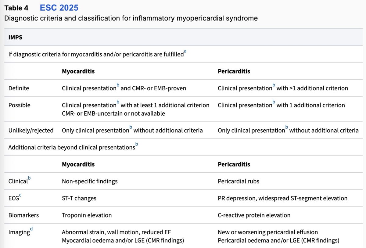 En raison du chevauchement potentiel entre myocardite et la péricardite, maladies inflammatoires respectivement du myocarde (« myopericarditis ») et du péricarde (« perimyocarditis »), il est convenu à la phase initiale du diagnostic, d’utiliser le terme syndrome inflammatoire myopéricardique (« inflammatory myopericardial syndrome« ) (guidelines ESC 2025 [10]). En effet, l’évolution d’une péricardite aiguë peut être rapidement bénigne sous traitement, mais en cas d’épanchement péricardique abondant ou de myocardite sévère voire fulgurante, l’évolution peut rapidement compliquée de tamponade, de trouble du rythme, de choc cardiogénique ou de mort subite.