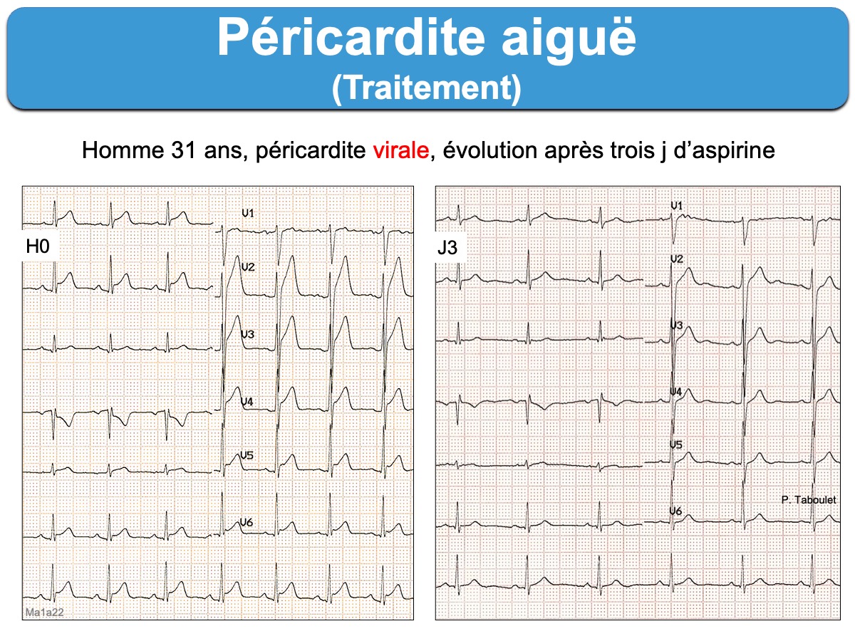 Le traitement recommandé (AINS et colchicine) peut faire régresser rapidement la clinique et l’ECG.