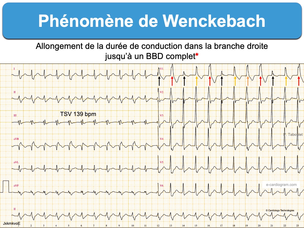 - fréquemment au niveau du nœud atrioventriculaire en rapport avec ses propriétés décrémentielles et correspond à un bloc AV II type Mobitz 1
