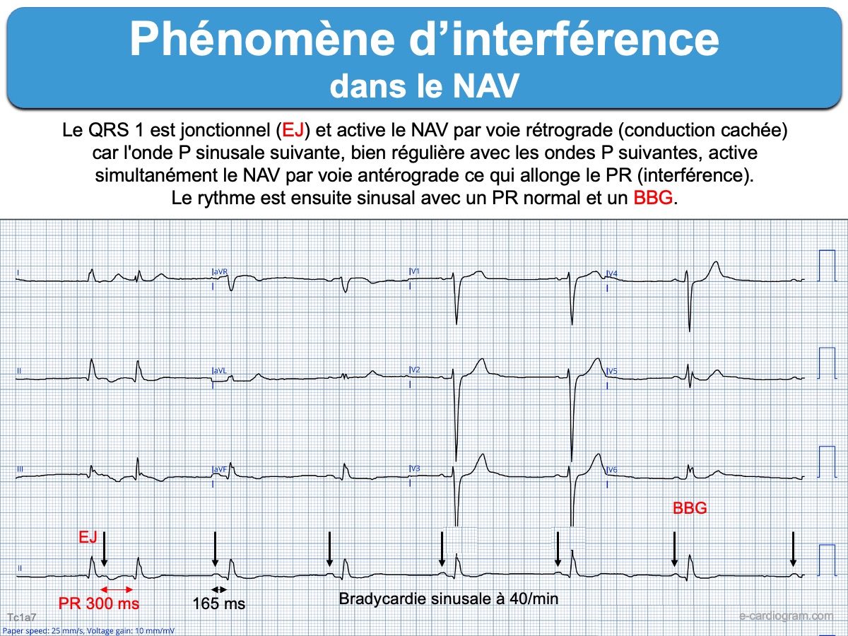 • une aberration nodale avec BAV1  temporaire (du à l’activation simultanée du NAV par voie supraventriculaire et ventriculaire) ou une extrasystole supraventriculaire bloquée (cf. ESJ ou ESA bloquée).