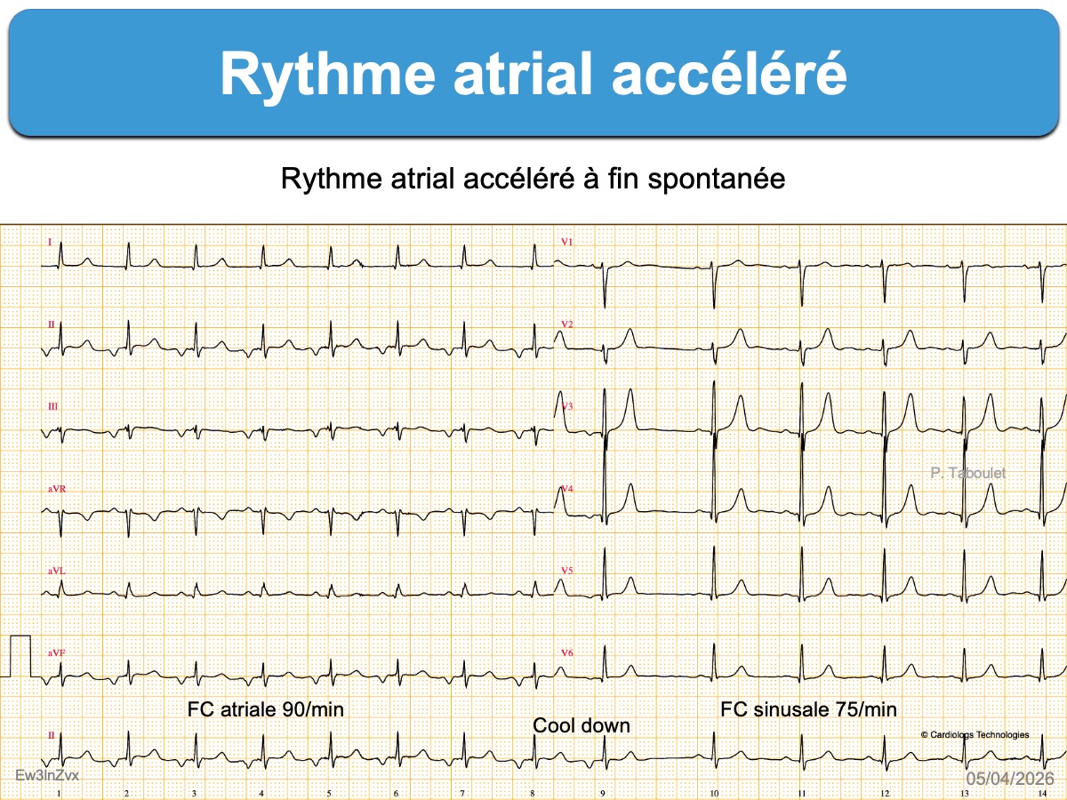 Rythme accéléré qui naît en dehors du nœud sinusal dans l’oreillette droite ou gauche et qui bat à une fréquence supérieure à la normale. Ce rythme est secondaire à un hyperautomatisme transitoire et bénin idiopathique d’un pacemaker physiologique accessoire.