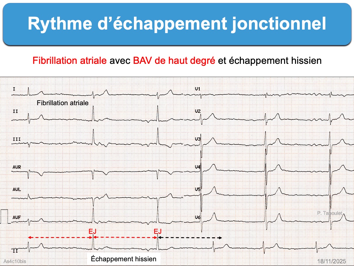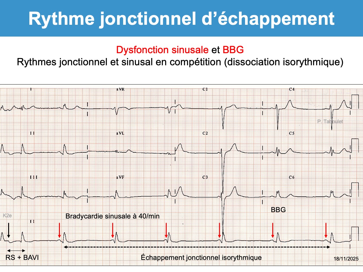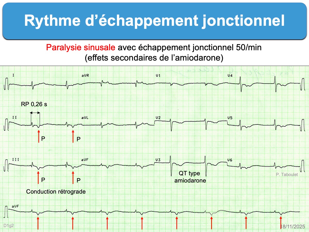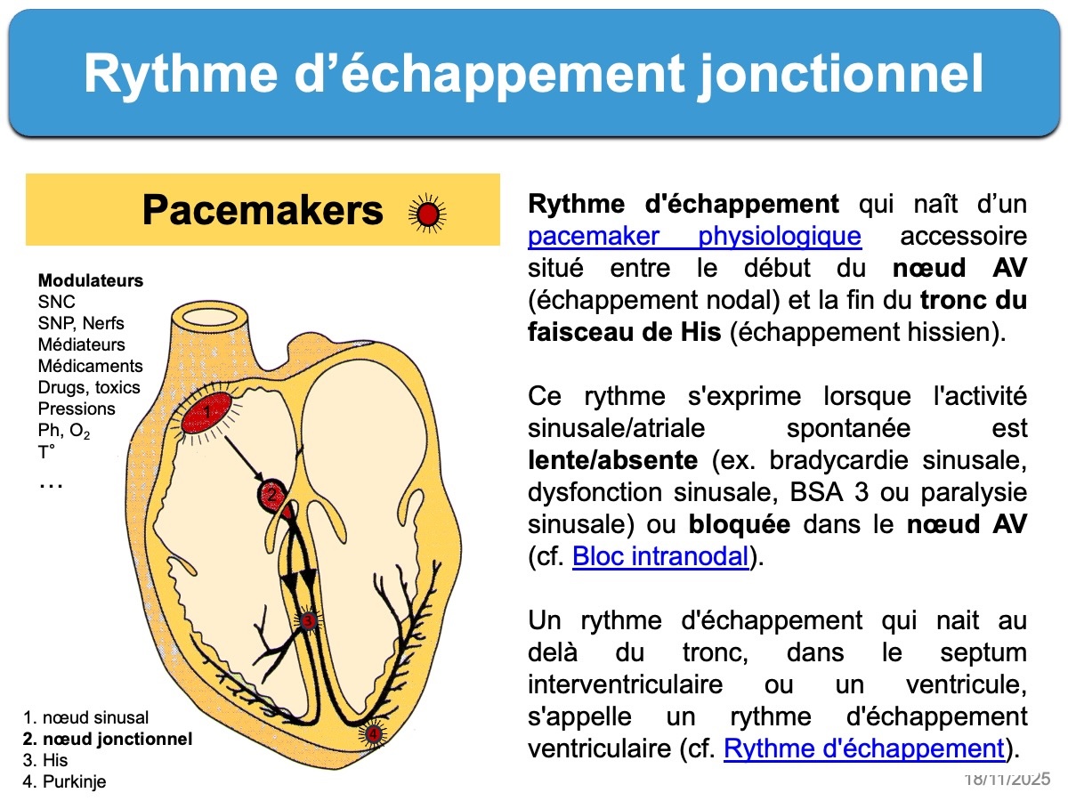 Ce rythme s’exprime lorsque l’activité sinusale/atriale spontanée est lente/absente (ex. Bradycardie sinusale, dysfonction sinusale, BSA 3 ou paralysie sinusale) ou bloquée dans le nœud AV (cf. Bloc intranodal).