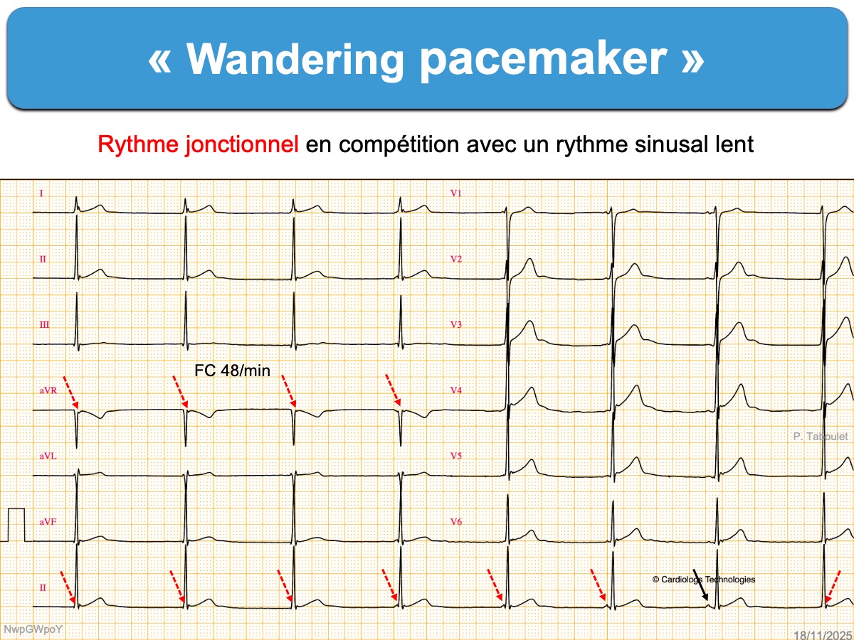 - Un rythme jonctionnel peut être isorythmique au rythme sinusal quand la fréquence des deux pacemakers est similaire. Les ondes P peuvent être cachées dans ou autour des QRS. On parle alors de dissociation isorythmique. L’ECG ci-dessous en est exemple. Il s’agit d’un rythme baladeur baladeur bénin (cf. (wandering pacemaker) enregistré fortuitement. Le rythme sinusal reprendra la commande du cœur dès que le tonus sympathique sera plus marqué et la fréquence sinusale plus rapide. Aucune exploration n’est nécessaire si le patient est asymptomatique et le reste du tracé normal.