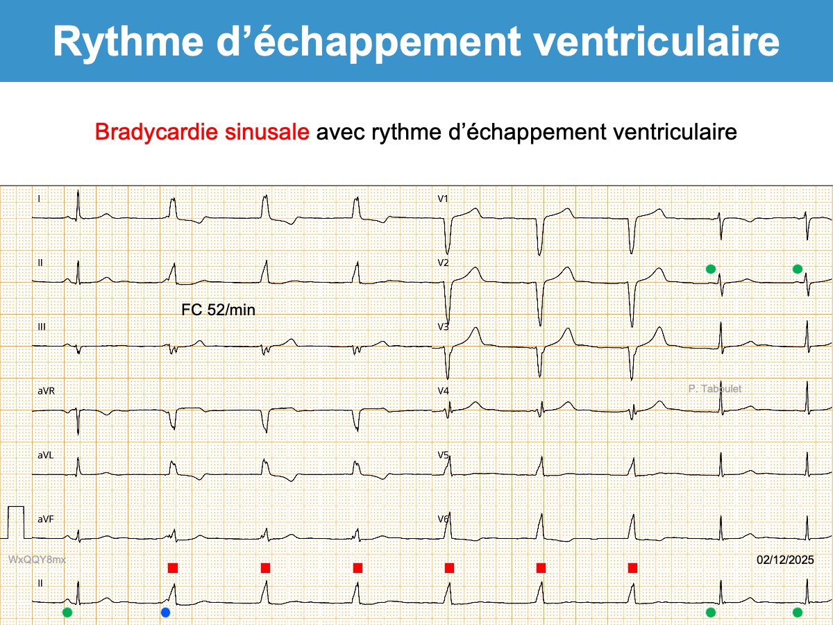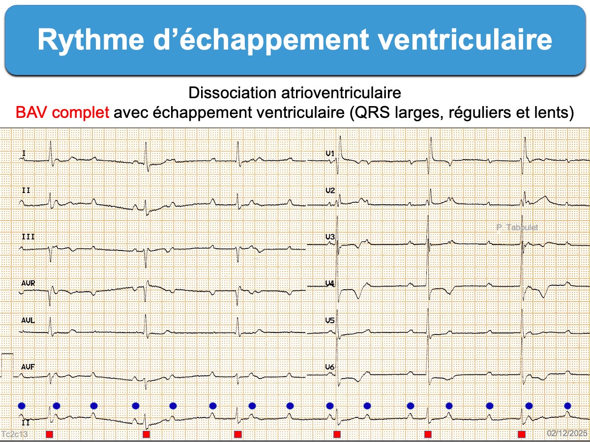 • Les QRS sont lents, larges et réguliers (≤ 40-50/min), d’autant plus lents, larges et atypiques que le foyer d’échappement ventriculaire est bas situé.