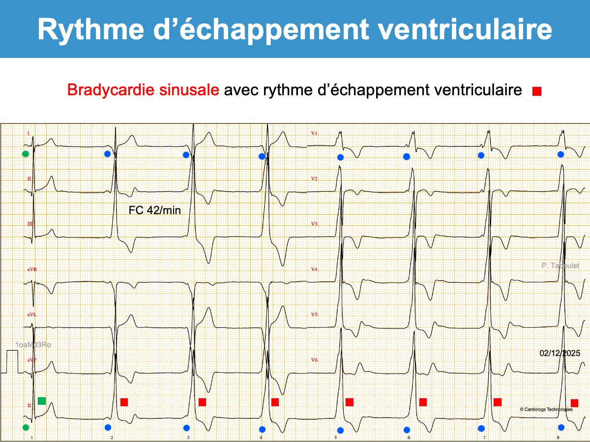 Il faut distinguer un rythme d’échappement ventriculaire (plutôt en dessous de 40 dépolarisations ventriculaires/min),