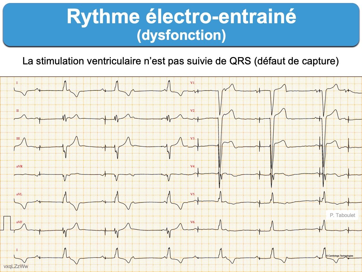 Un rythme ventriculaire entrainé se traduit par un spike qui précède chaque complexe QRS électro-entrainé.