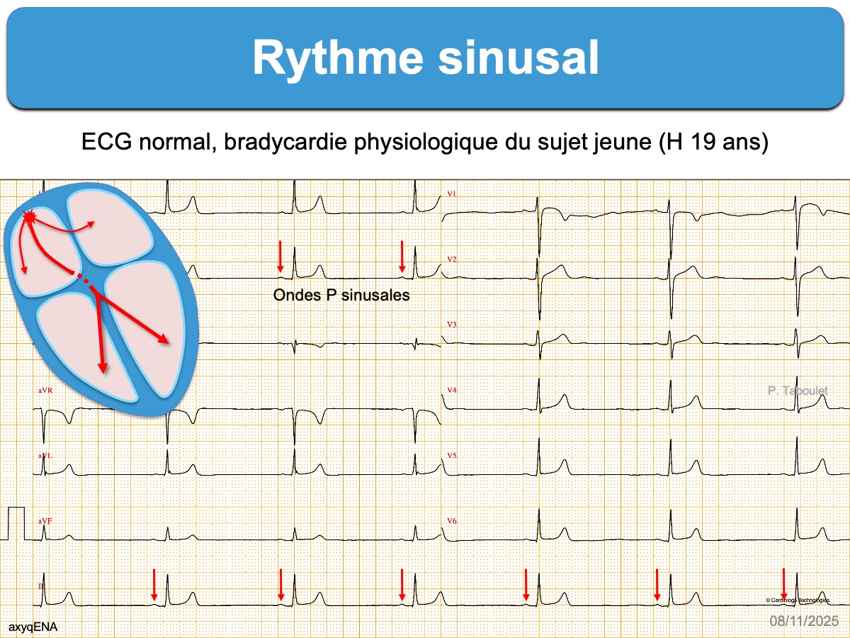 NB. Lorsqu’on dit qu’un ECG est en « rythme sinusal normal », on sous-entend qu’il s’agit d’un rythme sinusal associé à une activation normale des ventricules par les voies de conductions normales (NAV, His, branches, Purkinje). Il y a alors une onde P devant chaque QRS et un QRS derrière chaque onde P.