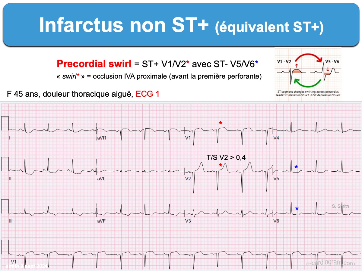 - le ST+ est subtil en territoire antérieur en V1 et V2 (ou T/S V2 > 0,4) avec ST- en V5 et/ou V6 (« precordial Swirl » ou « tourbillon précordial ») [12])