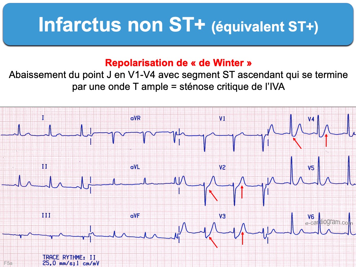 - le ST+ est remplacé par un ST- antérieur ascendant vers une onde T ample (cf. de Winter pattern) du fait d’un réseau collatéral protecteur (ischémie critique) [6]