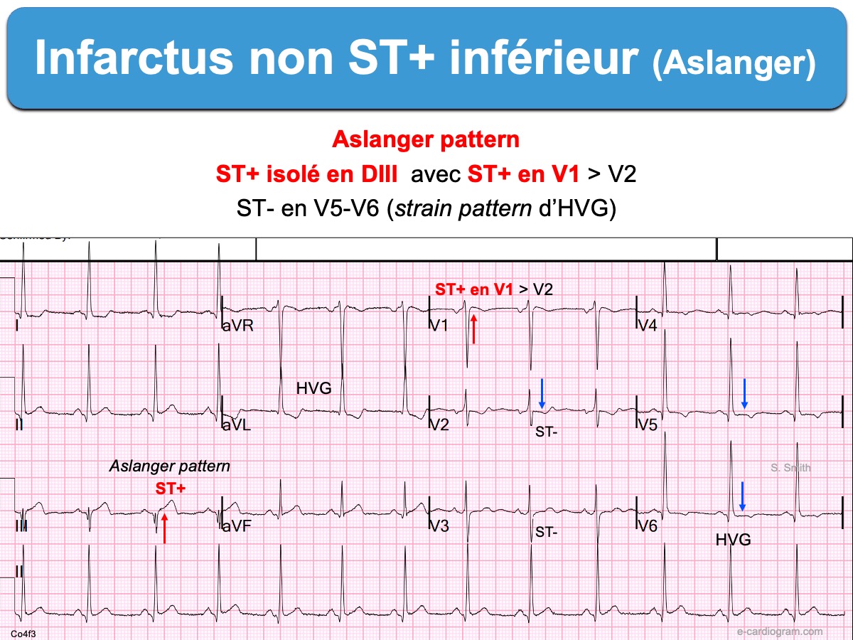 - le ST+ est subtil en territoire inférieur en D3-VF (ST+ ≤ 1 mm, QRS peu voltés ou Aslanger pattern)