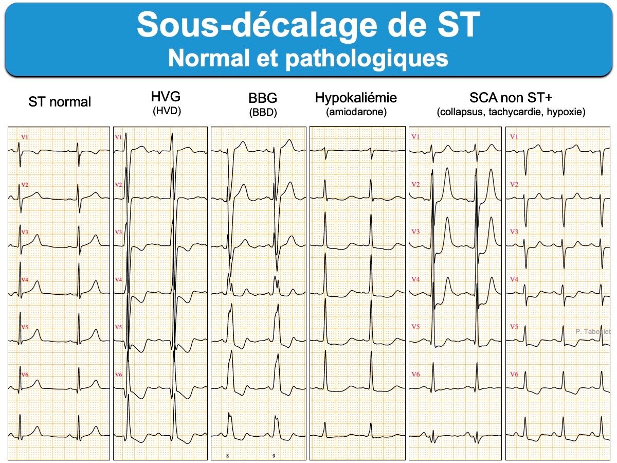 - Le segment ST peut être physiologiquement sous-décalé au maximum de 0,5 à 1 mm selon les dérivations et les situations cliniques [2]. En cas de SCA, tout sous-décalage de ST en V1-V3 est suspect de traduire un infarctus basal. L’analyse de la pente de ST (ascendante, horizontale ou descendante), la fréquence cardiaque, la durée, la polarité et l’amplitude des QRS, et aussi celle de l’intervalle QT est essentielle pour préciser une étiologie (cf. Sous-décalage de ST).