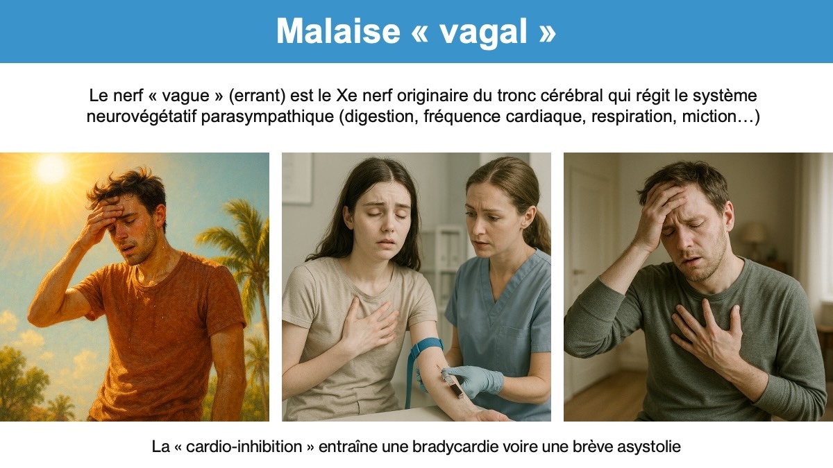 * Autres situations ou activités qui peuvent déclencher un freinage vagal à l’origine de syncope : miction (nocturne), déglutition (douloureuse), rire ou tousser de façon prononcée, jouer d’un instrument à vent (cuivre), chanter, pratiquer un effort d’haltérophile (manœuvres de Valsalva) etc.