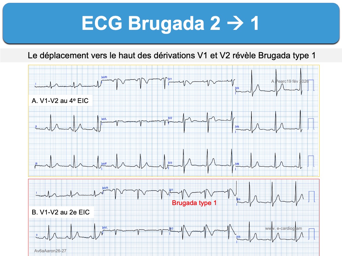 - en élevant les électrodes précordiales V1-V2 (4e espace intercostal) en regard de la chambre de chasse du VD (au 3e ou 2e espace intercostal). Si un type 1 devient visible, le diagnostic de syndrome de Brugada peut être porté [1][5][6]. Cette manoeuvre est hautement recommandée en cas de pattern type 2 ou douteux.