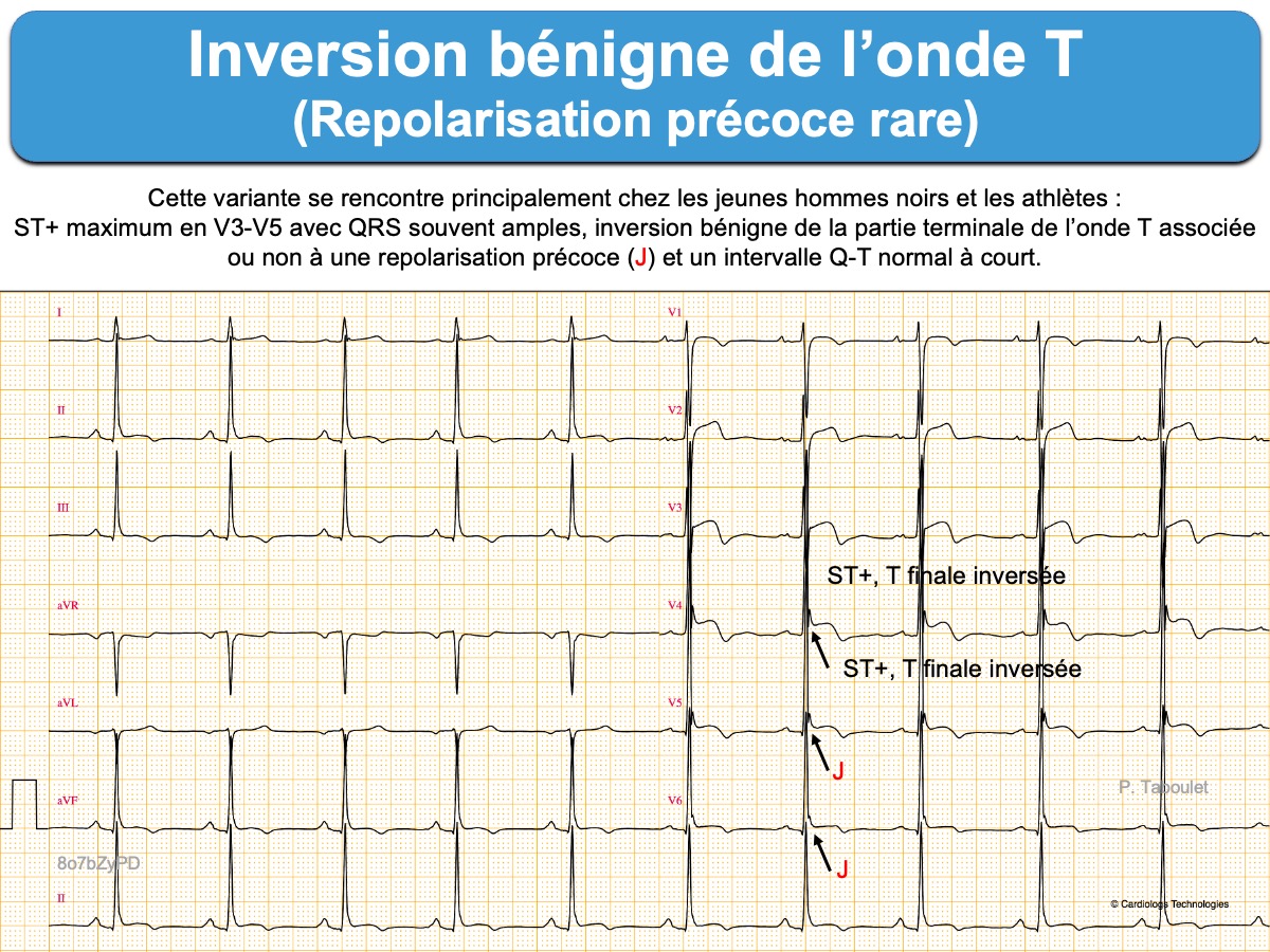 • Inversion bénigne de l’onde T avec QRS amples en V2-V4 et un QT plutôt normal-court < 400 ms. Cette variante se rencontre chez des jeunes hommes noirs, parfois athlétiques et asymptomatiques… (cf. Inversion bénigne de l’onde T).