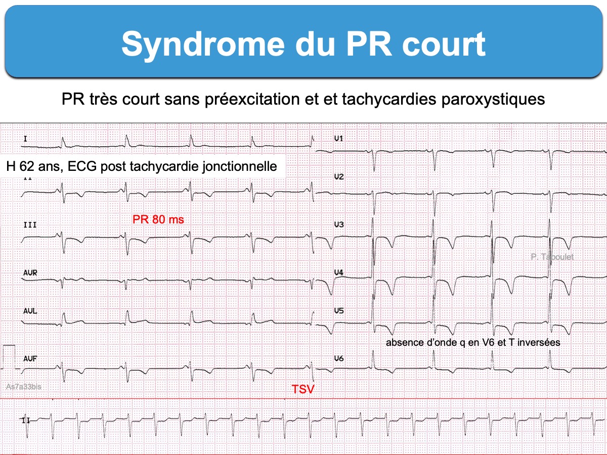 - En cas de symptômes (accès de tachycardies supraventriculaires paroxystiques), le PR court s’inscrit dans le syndrome du PR court car il peut être à l’origine des accès.