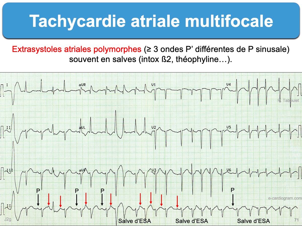 Tachycardie atriale avec multiples extrasystoles atriales polymorphes (au moins 3 ondes P différentes), souvent en salves [1][2].