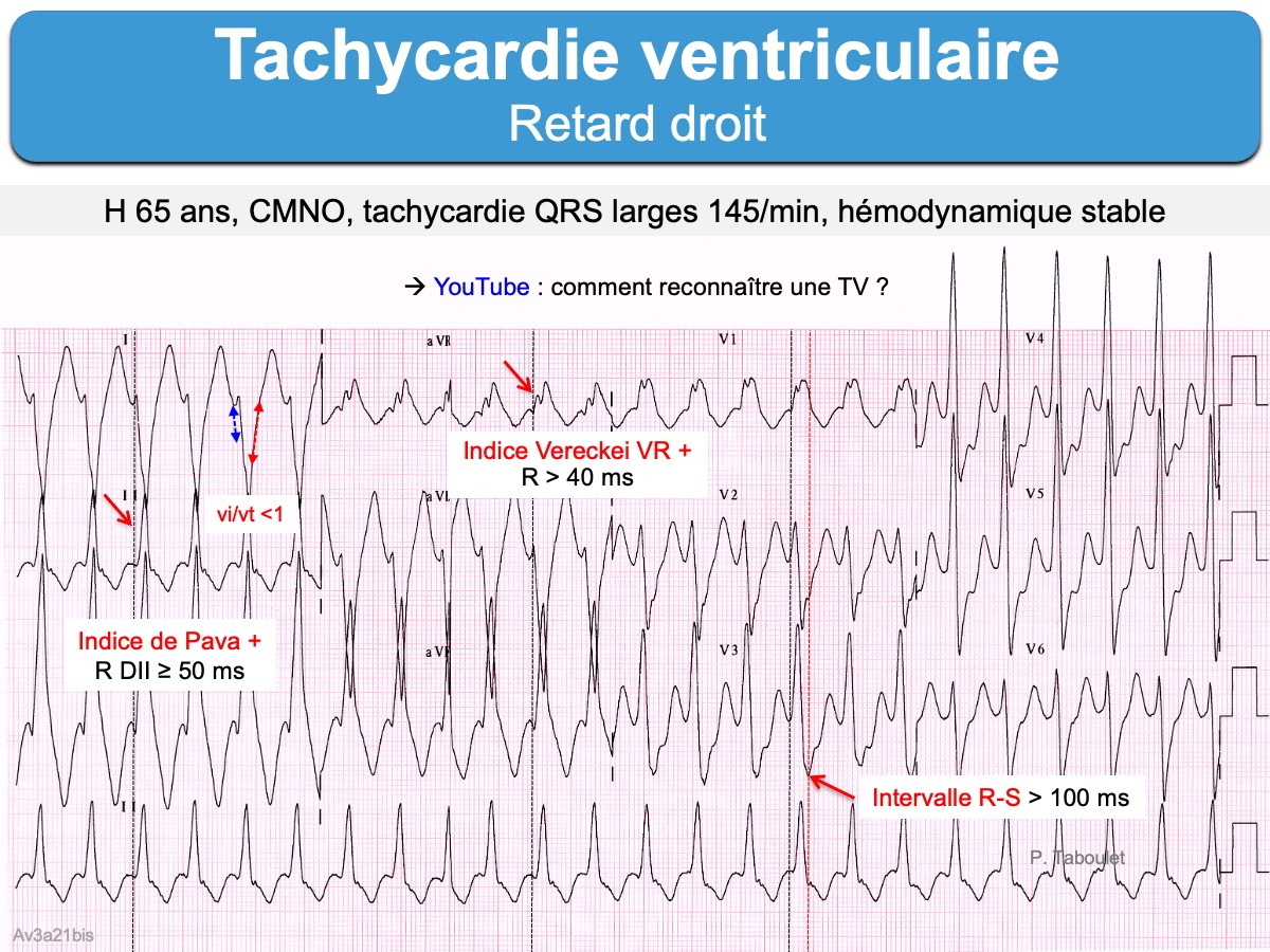 - s’il existe un bloc de branche controlatéral à l’aspect des QRS larges per tachycardie, l’arythmie est probablement une TV.