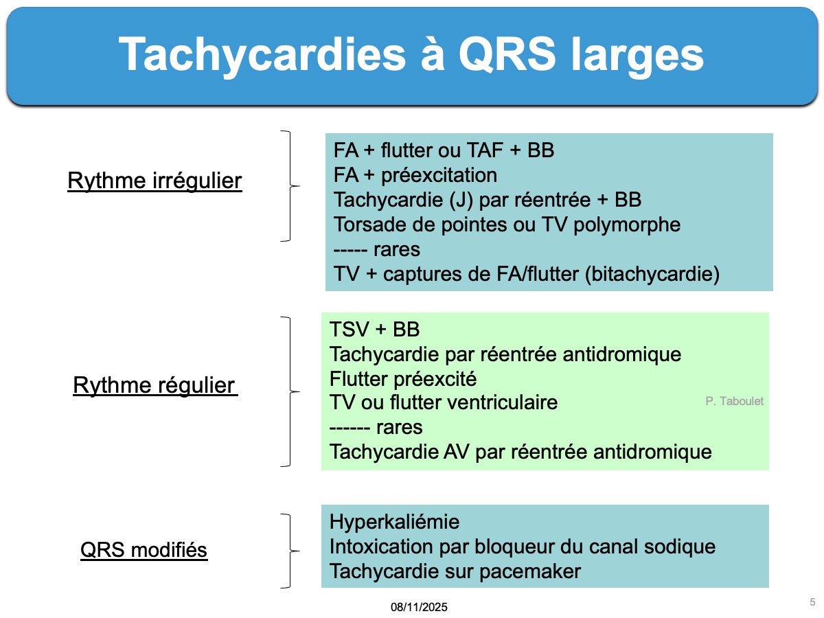 Les tachycardies à complexes QRS larges (≥ 120 ms) et régulières forment une famille dont les mécanismes, les aspects ECG et les pronostics sont particulièrement hétérogènes [1][2][3].