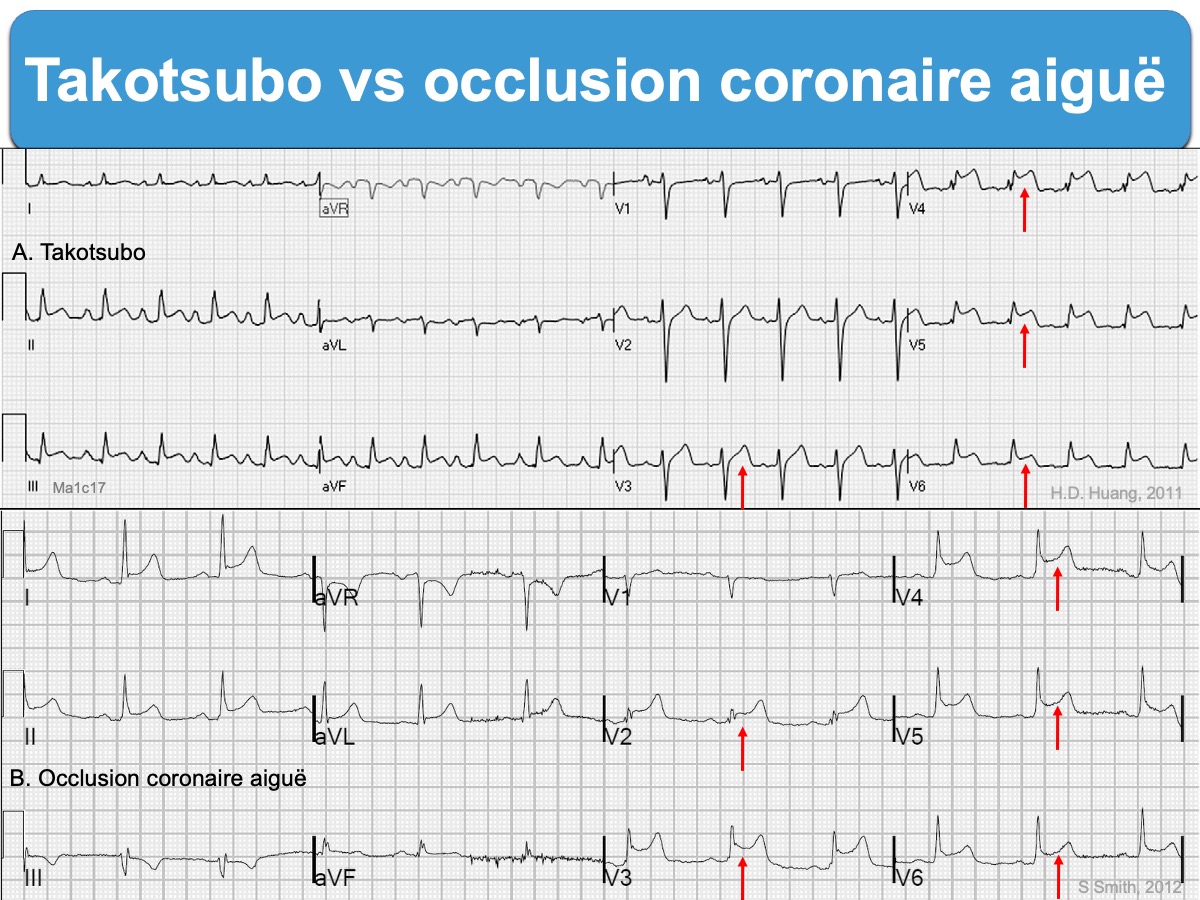 Mais tous les ballonnements apicaux ne sont pas takotsubo. L’occlusion coronaire aiguë d’une IVA « enveloppant la pointe » entraînera les mêmes résultats.–> voir ici.