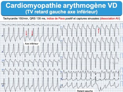 En cas de tachycardie à complexes larges avec retard gauche (QRS principalement négatifs en V1), on peut identifier une tachycardie ventriculaire à l’aide de critères morphologiques des QRS à fortes valeurs prédictives positives (cf. indices de TV) et intégrés dans des algorithmes de TV proposés par Brugada [1], Vereckei [2][3] ou Pava [4].