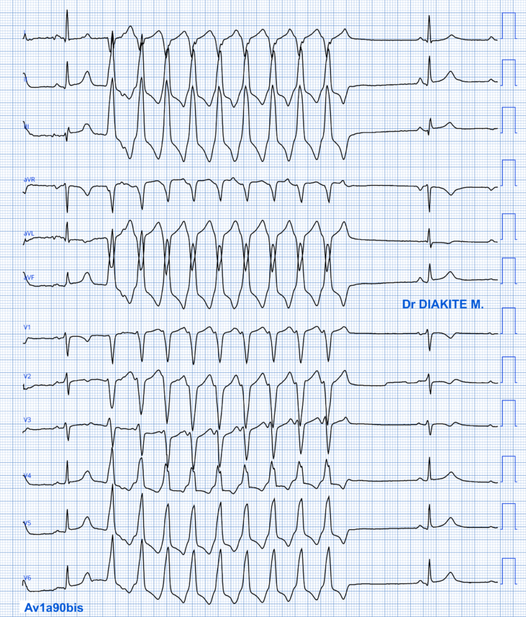 Les salves de TV peuvent être soutenues (> 30 secondes) ou rapidement répétitives. La salve s’arrête généralement après un léger ralentissement de la cadence ventriculaire (ce qui n’est pas le cas ci-dessous).