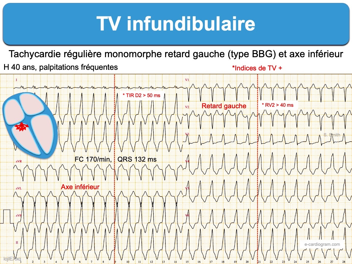 Certaines TV naissent au niveau de l’infundibulum du ventricule gauche ou au niveau des sinus de Valsalva. Elles gardent un axe inférieur ou droit, mais présentent un retard droit ou intermédiaire en V1 et V2 [4].