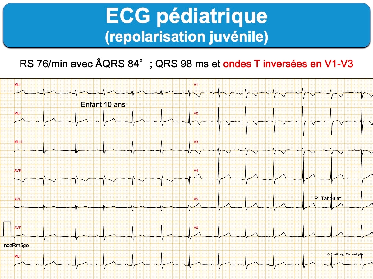 – inversées dans le cadre d’une repolarisation juvénile (« repolarisation atypique du sujet jeune »). T < 0 en V1-V3(V4)